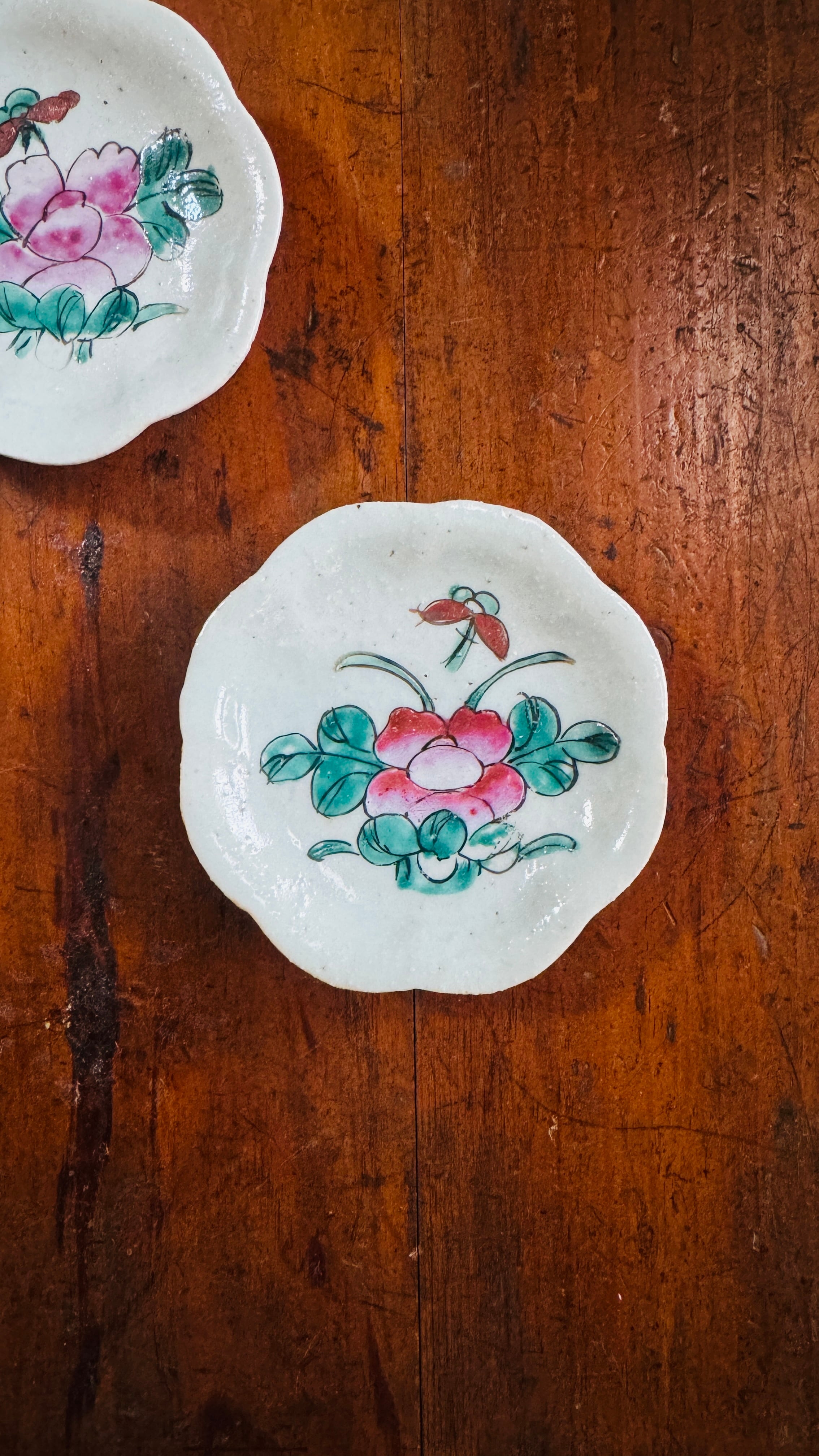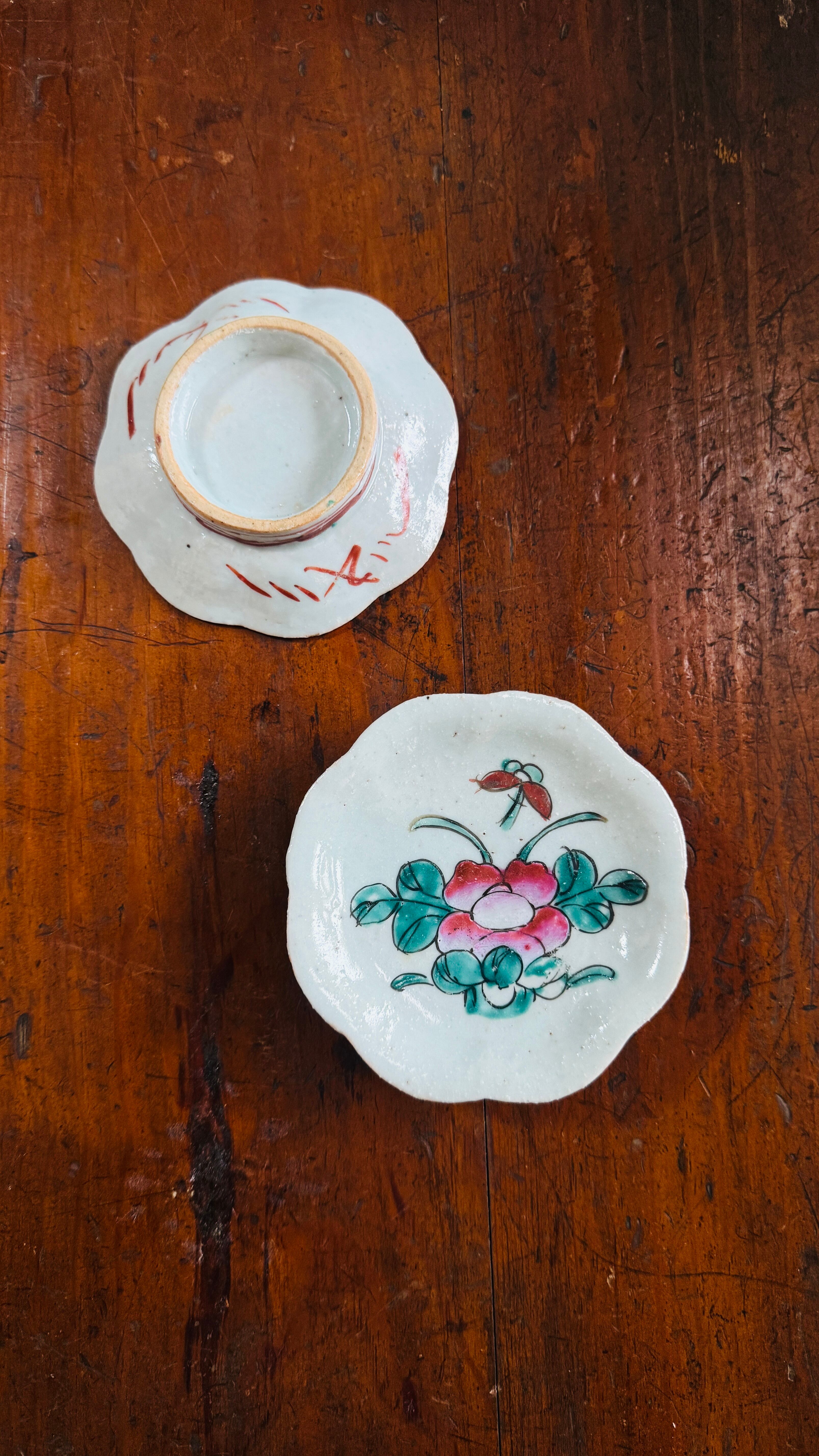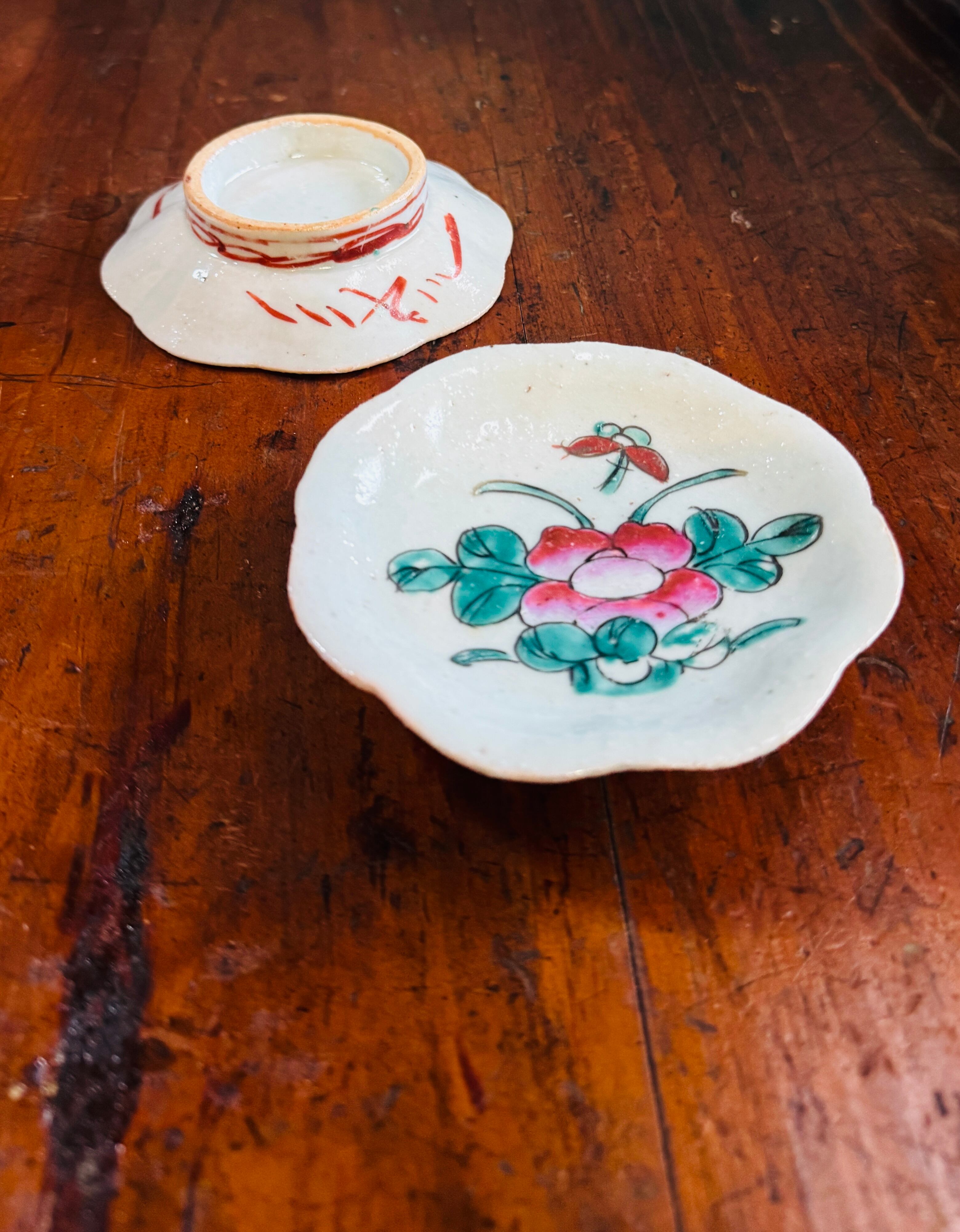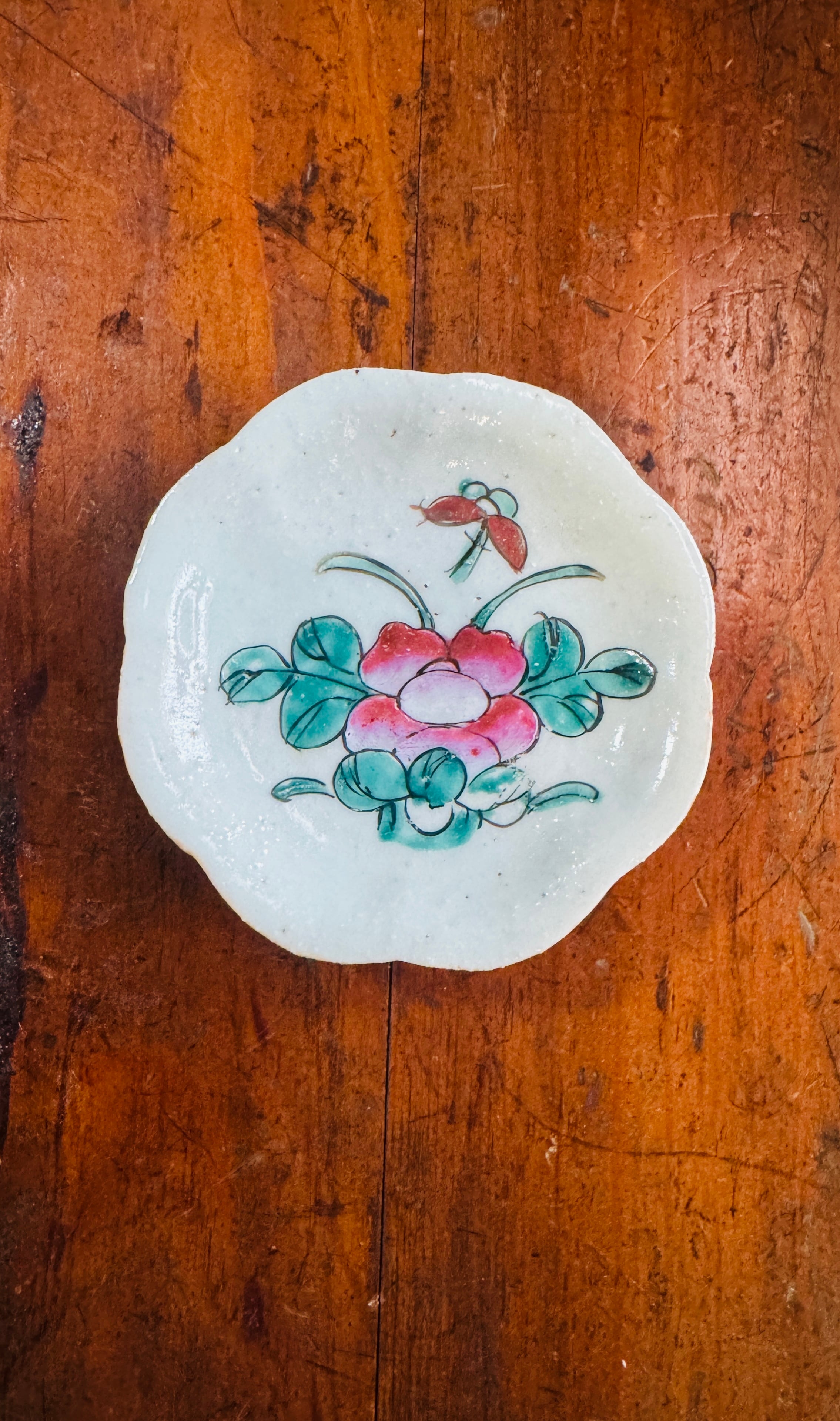 白く濁った下地(鉛白)を使った粉彩ならではの、ふんわりとした色合いと、輪花形の上品な縁取りが美しく調和しています。