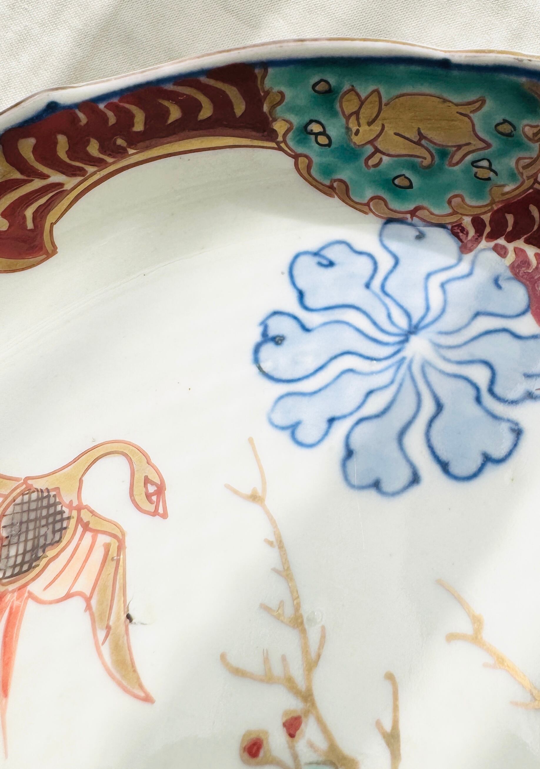 稀少 古伊万里 輪花皿 中皿1客 うさぎ鳳凰文 上品で華やかな骨董皿 金彩色絵皿