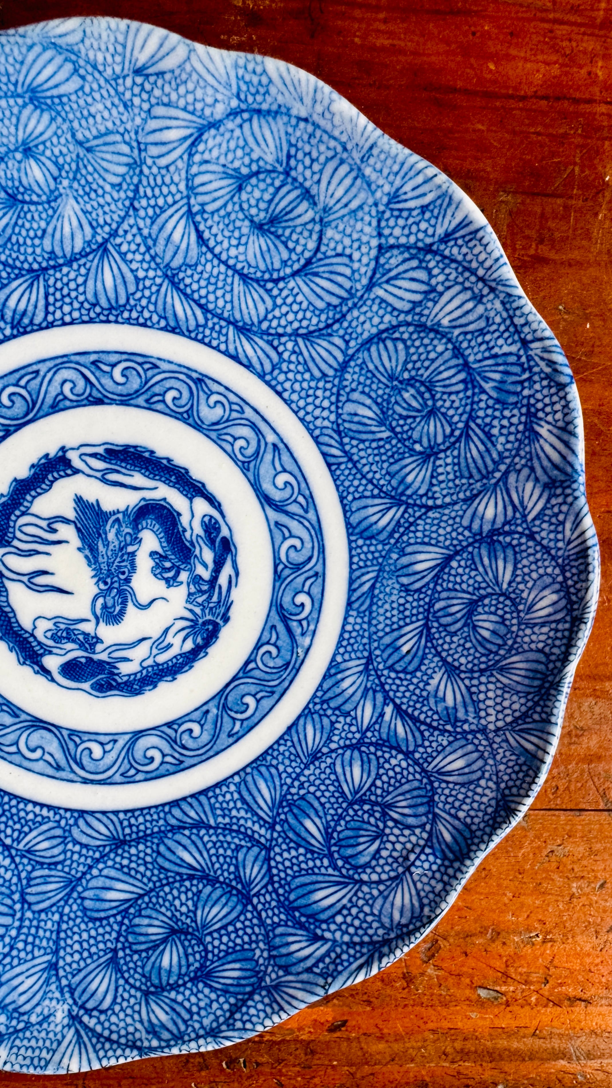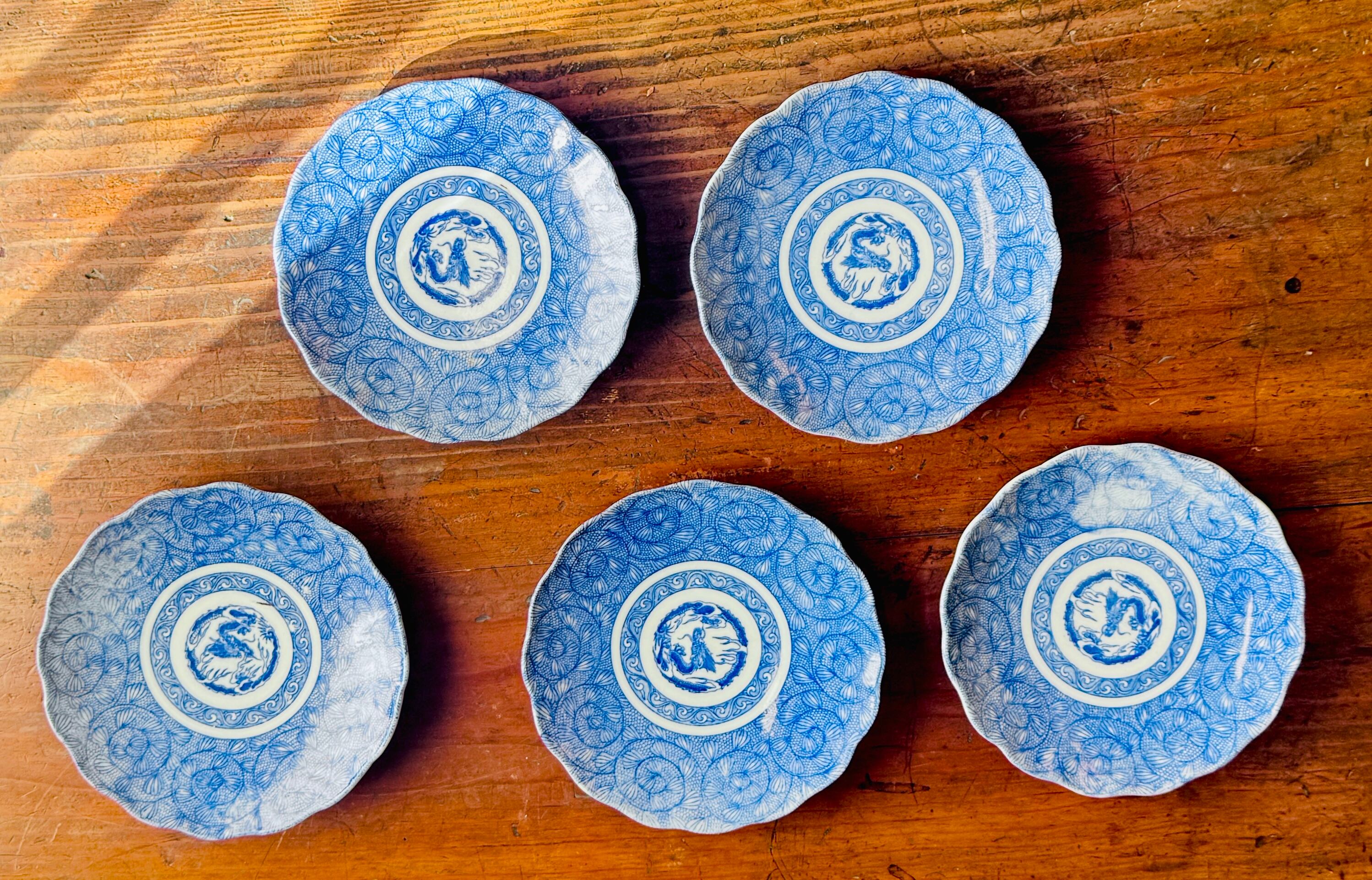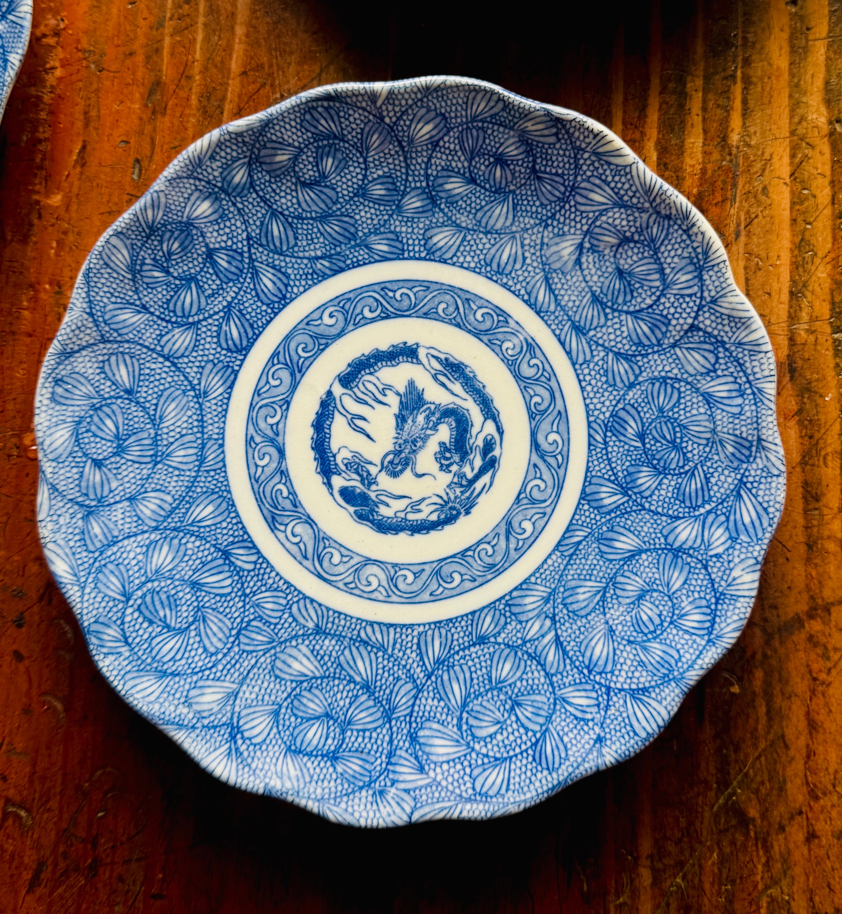 骨董皿 明治期 印判皿18cm 染付龍唐草花文 二枚セット