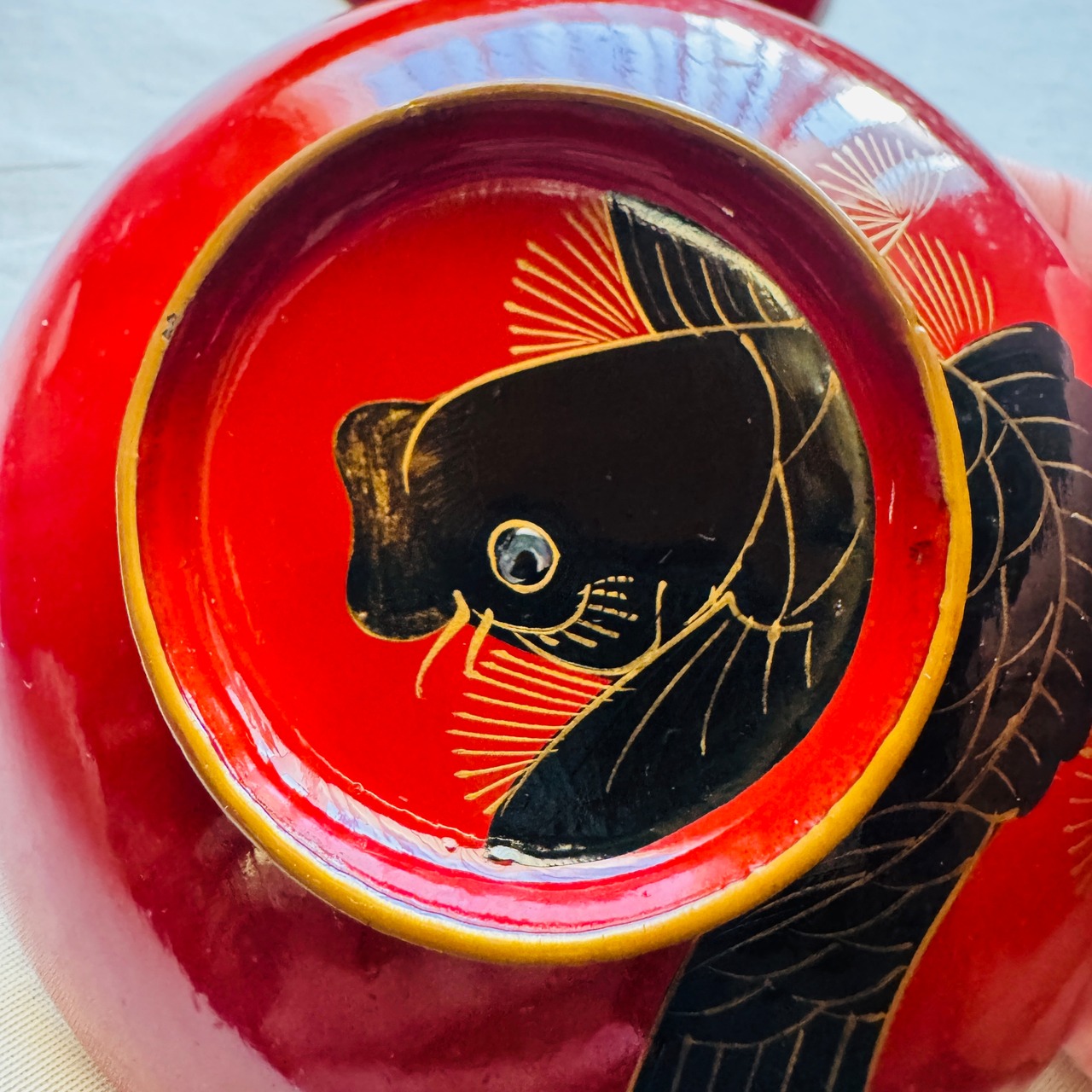 角度によってさりげなくきらめく鯉の目が螺鈿で