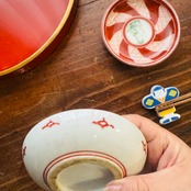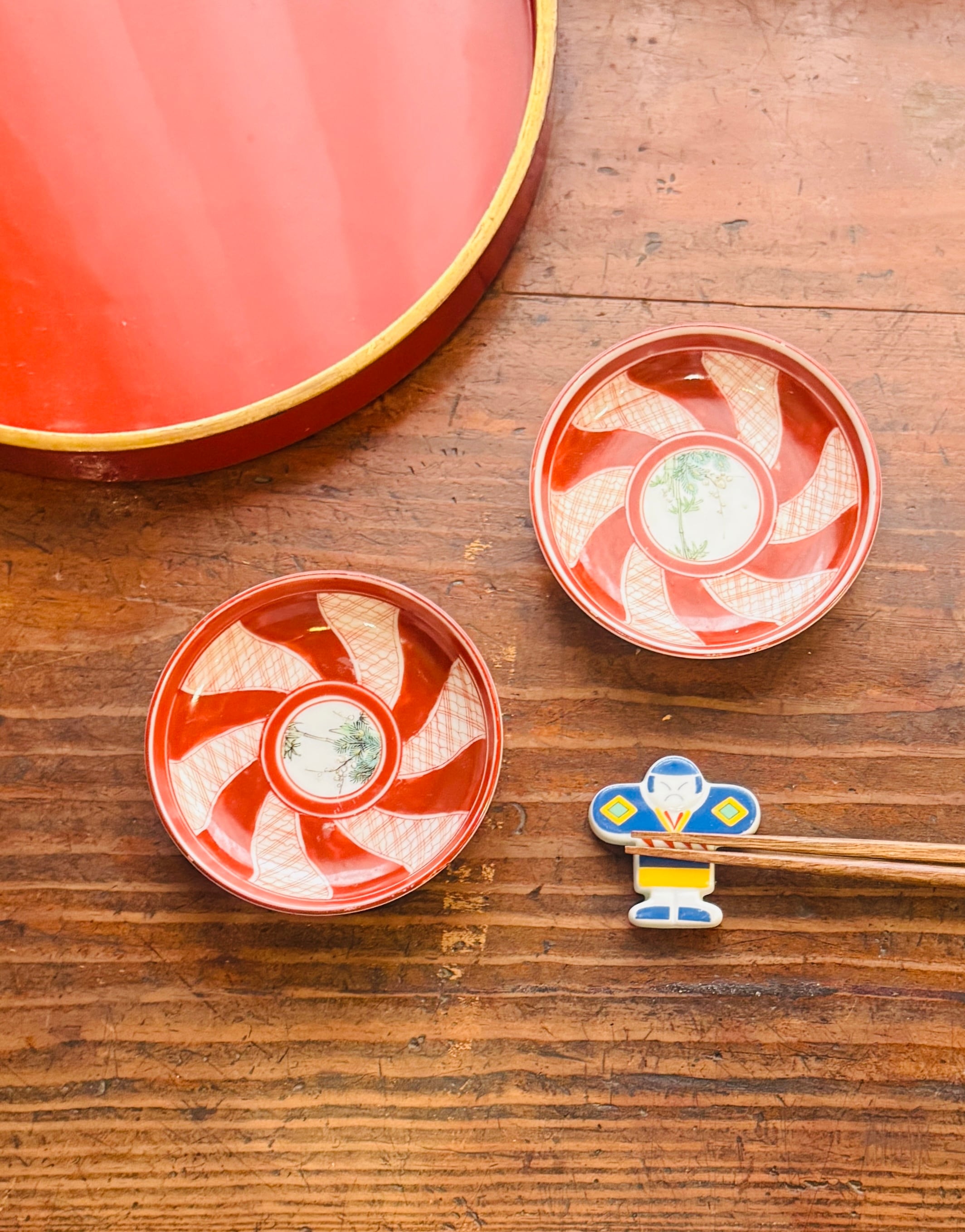 伊万里焼の赤絵で、捻り文が印象的な小皿です。