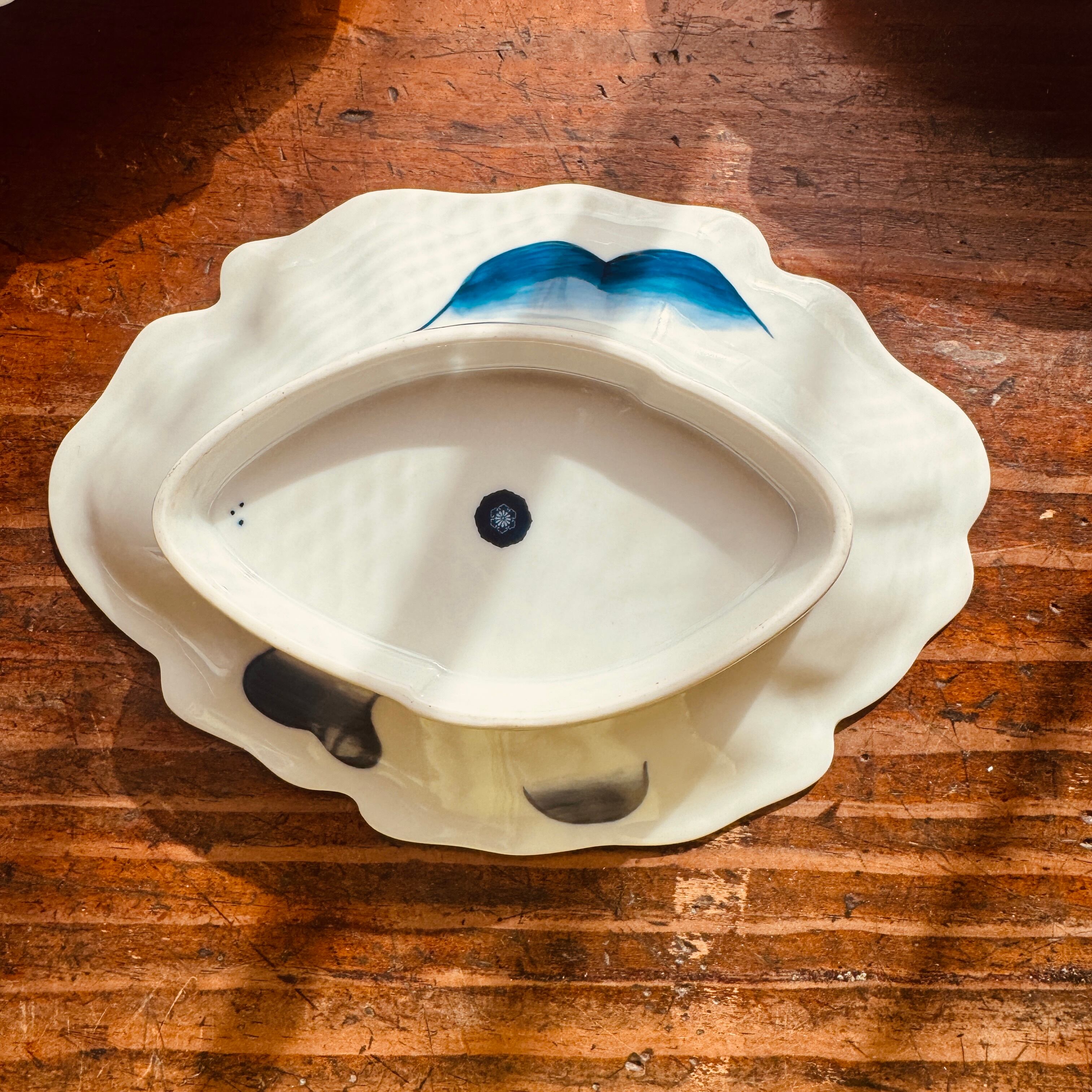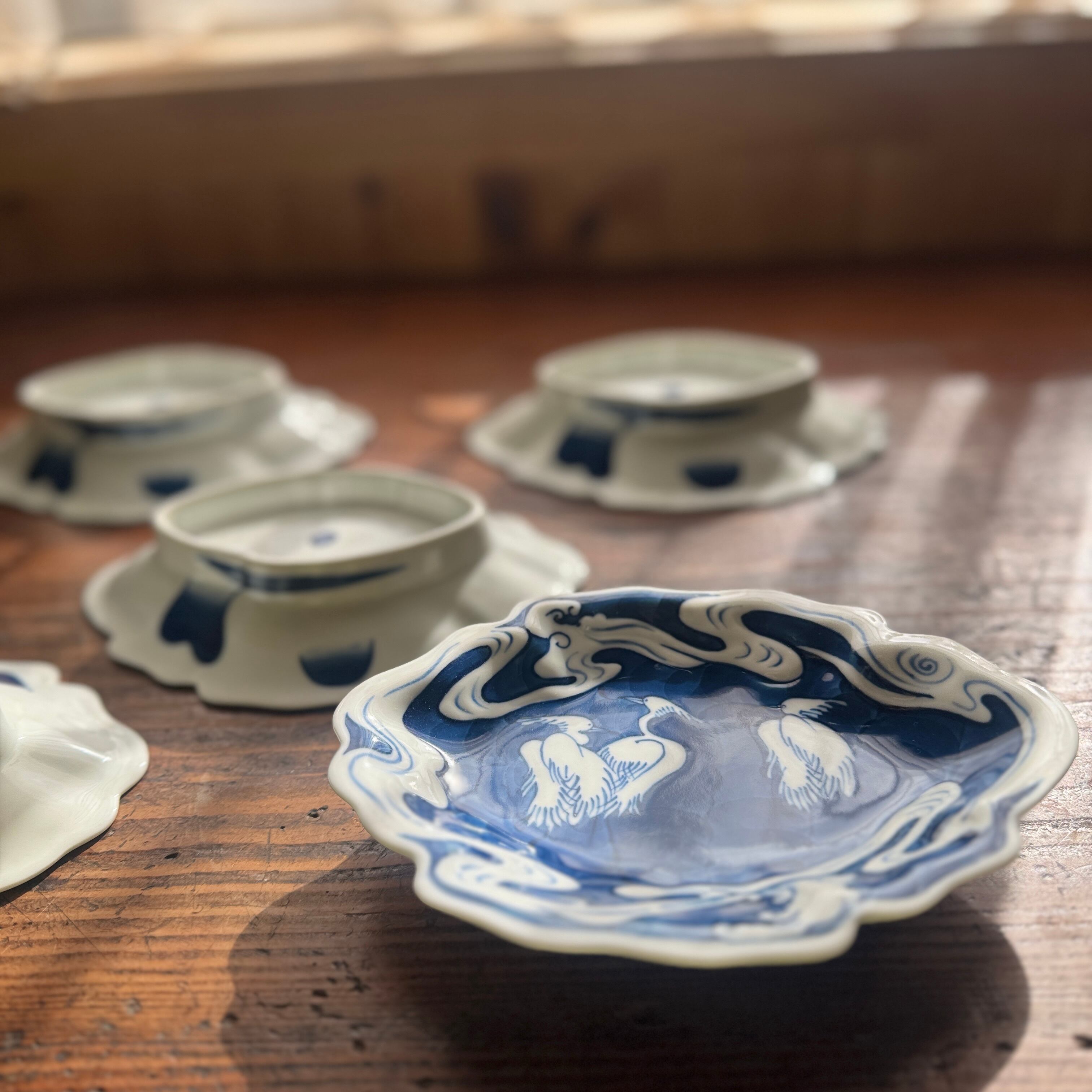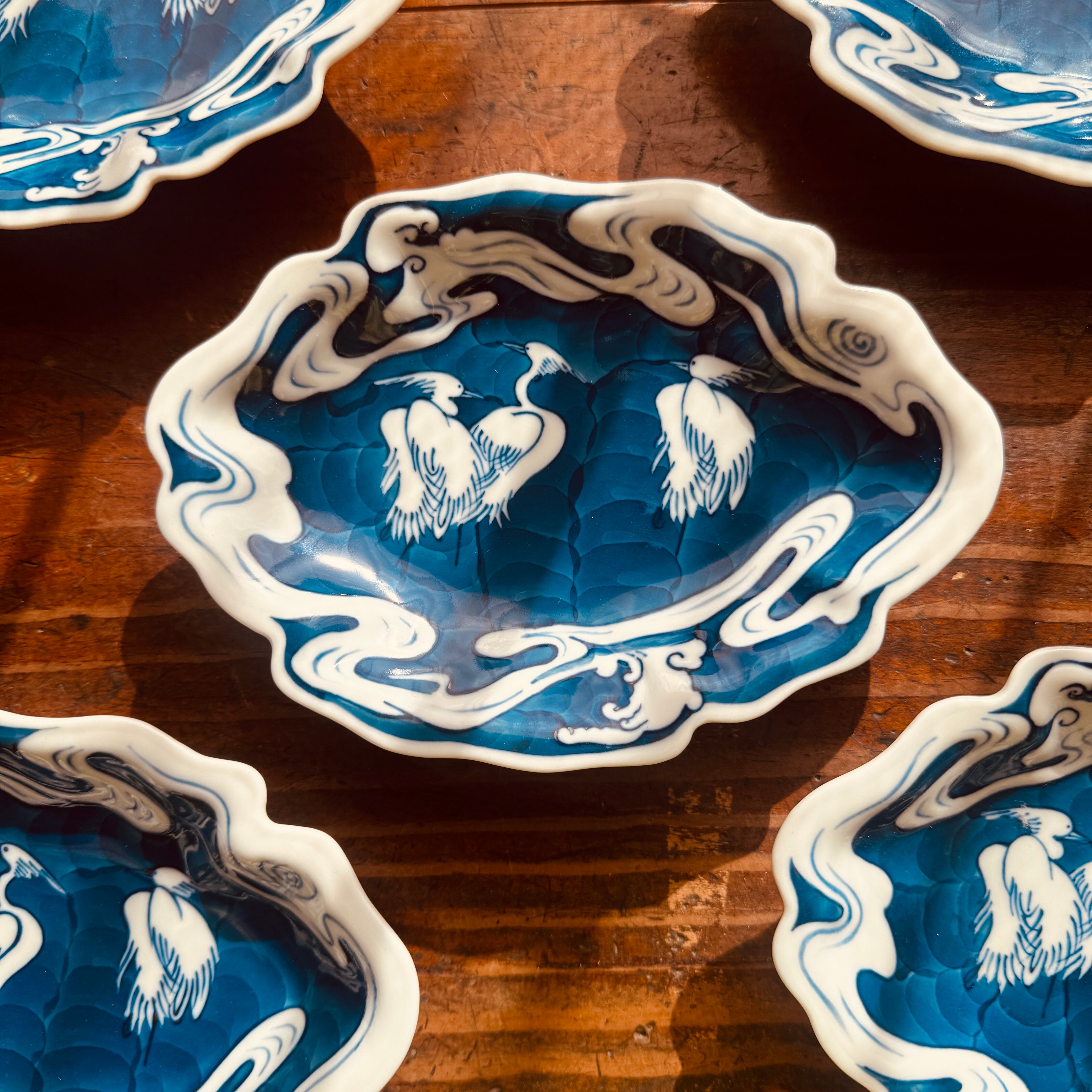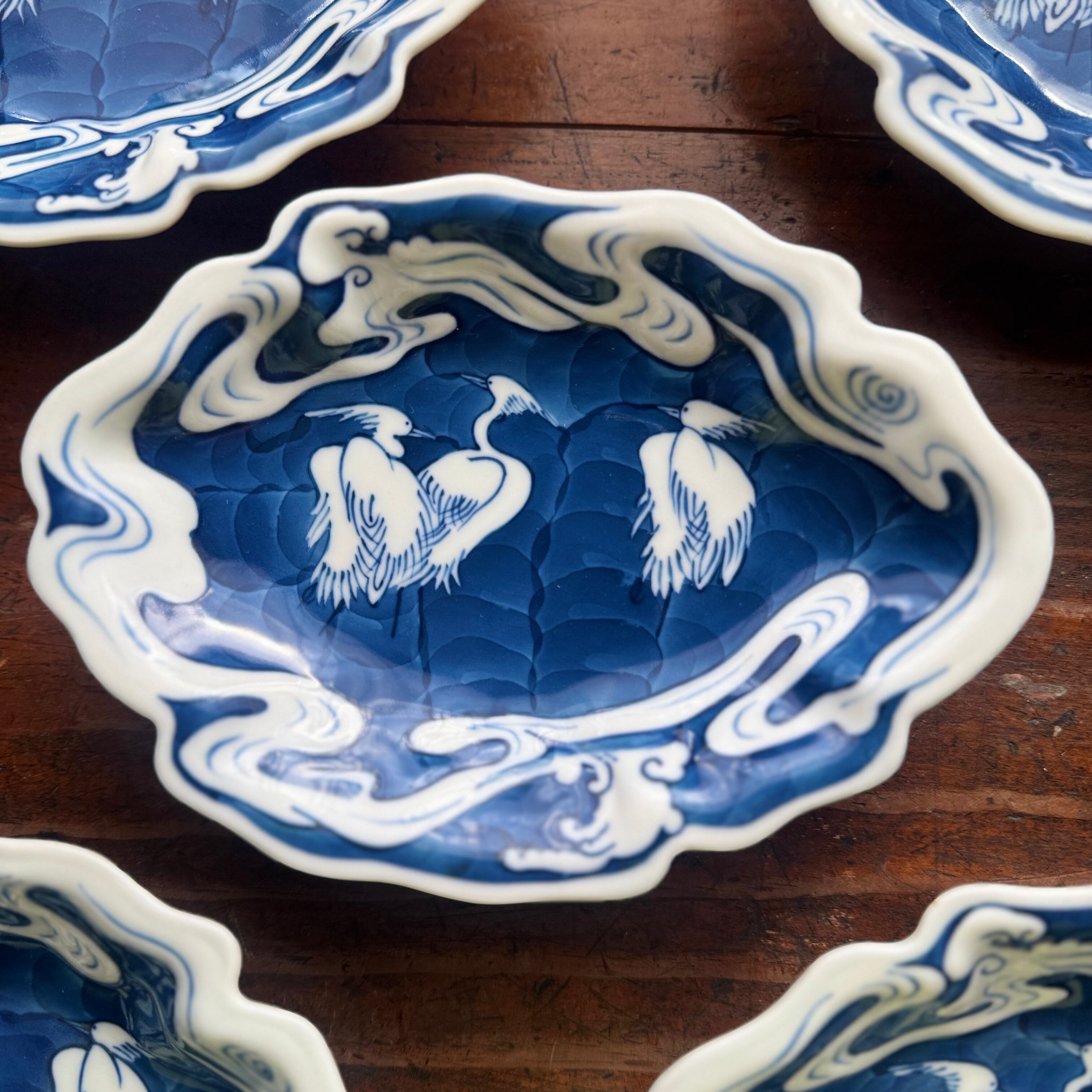 白と藍のコントラストが美しい 鍋島写 鷺文 変形波形皿5枚揃い